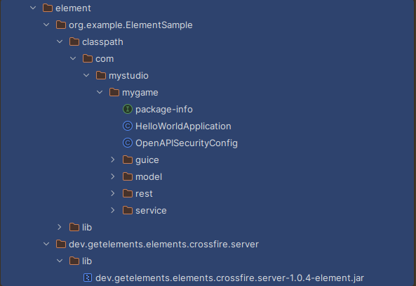 libs– a directory containing the jars of the Element’s dependenciesclasspath– a directory containing the classpath of the Element itselfattributes.properties– a file added at deployment time which contains configuration