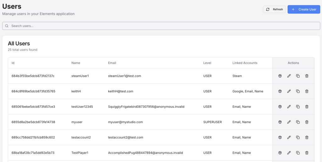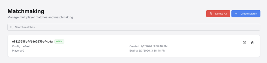 The Matchmaking section allows for you to see all current matches. You can also manually create matches, as well as delete one, or all matches. This can be useful for quick iterations when debugging your game, as well as player support operations.
