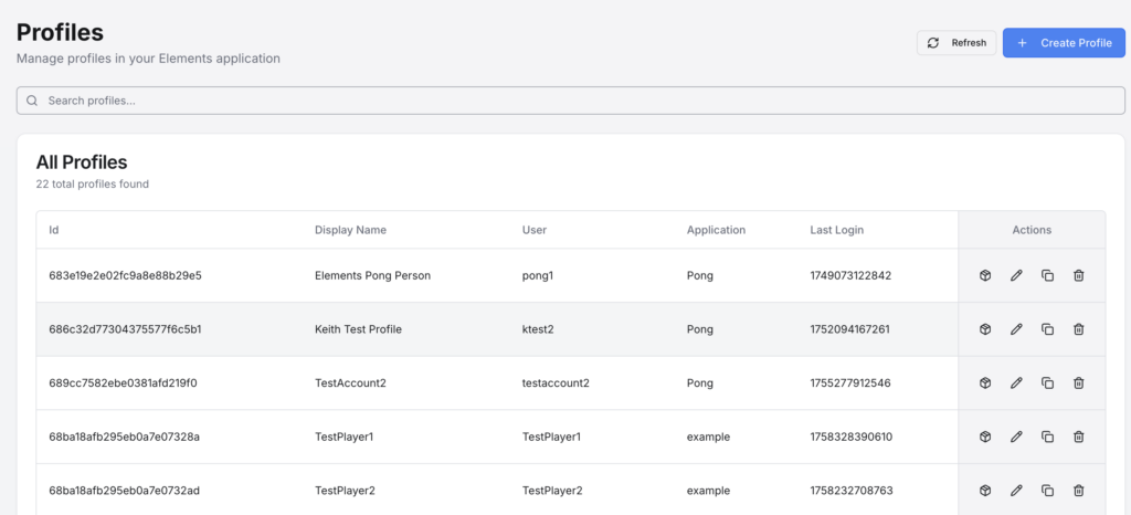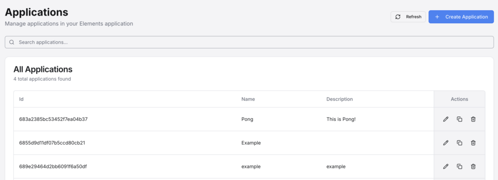 The Applications page allows for you to create new and manage existing Applications. Creating an Application is a required first step for a variety of other actions, such as creating Profiles, and adding custom code to/extending Elements’ functionality. See here for more information on Applications.