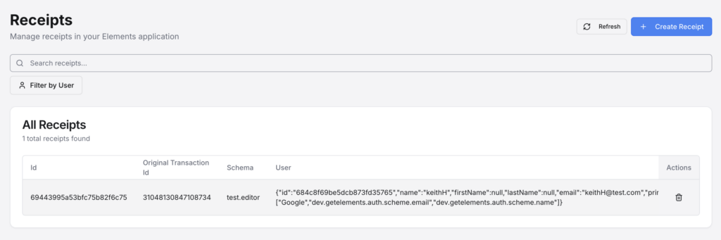 This shows you the raw receipt data. Since receipts can come from a variety of sources and can be formatted differently based on that source, we store the receipt’s raw data attached to our generic Receipt model. This is mainly used to verify purchases that the user made and help resolve any issues they may have had in redeeming an item, or restoring a purchase. Search will look through either the Original Transaction Id or the Schema.