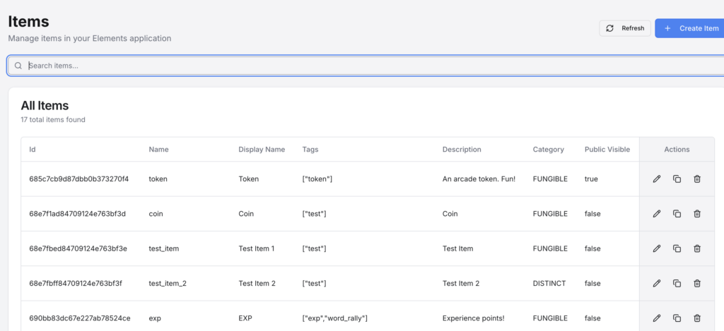 The Items page is where all of the Item definitions are located. It is necessary to define an Item before you can set it as a reward for missions or add it to a User’s inventory. See Digital Goods for more information.
