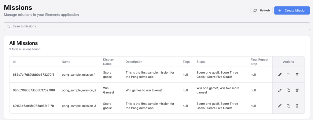 This is where you can define all of the information for a Mission in your game. Missions can get pretty detailed, allowing you to define multiple steps and rewards for each step along the way. A Final Repeat Step can also be assigned in the event that you want it to be repeatable by the user. Once a Mission is started by the User, it becomes a Progress object, which tracks the User’s current Step. See Missions and Progress for more information.