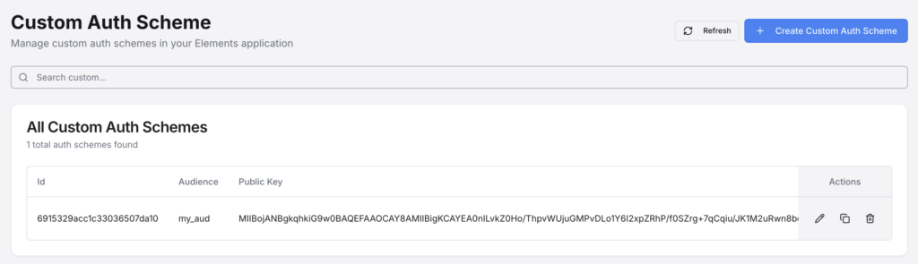 Custom Auth Schemes can be defined as well for use with any custom auth flows that you might want to author. This will generate a public/private key pair with encryption options and other metadata that you can configure.