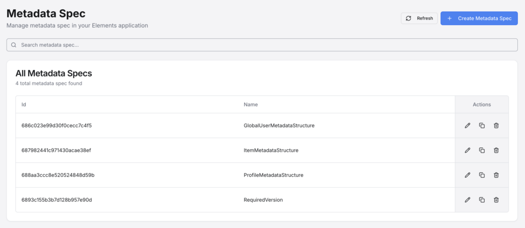 This page allows for you to create and manage Metadata Specs. These allow you to define the structure that a Metadata object or a metadata field on another object (such as Items or Profiles). This can be very powerful as it lets you predefine how Metadata should be handled and what the various field names can be on different objects, which effectively allows for you to extend the functionality of existing object types within Elements. See Metadata for more information.