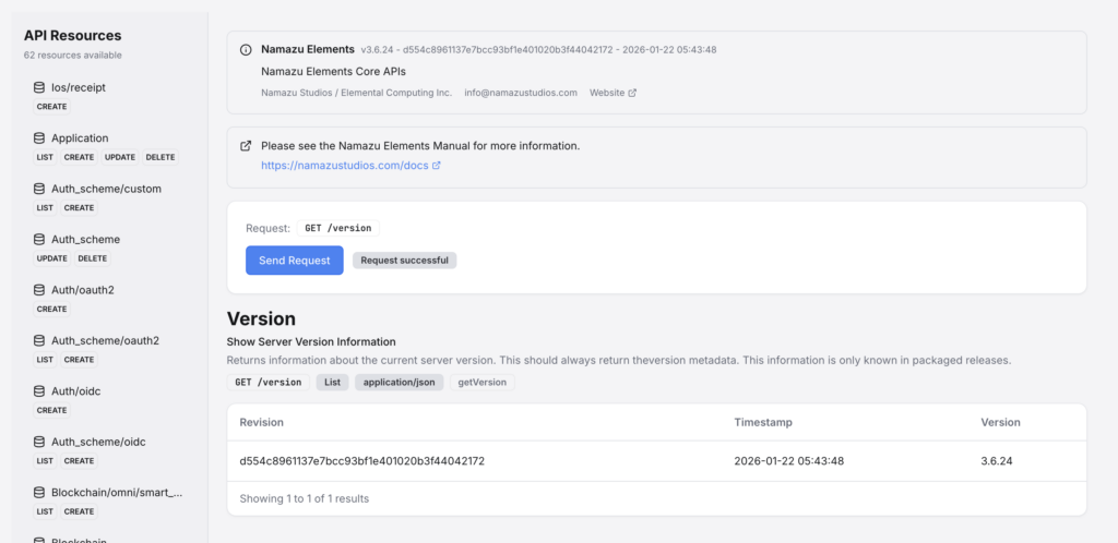 The Core API section allows you to look at the entirety of the Elements API and test out endpoints. It downloads a generated Open API Specification 3 (OAS3) file and creates UI dynamically. This can be useful for quick testing or reference. For most requests, it will use the session token that allows you to access the CMS. This can be overridden for some requests if you want to test endpoints as a different User.