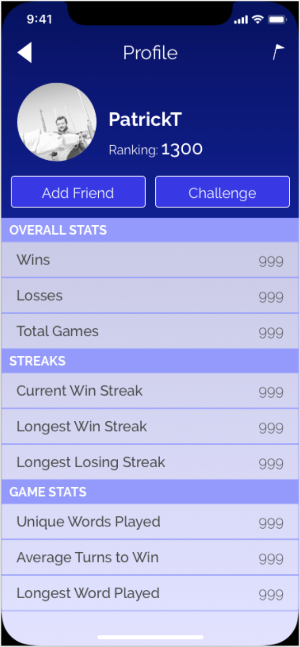 As mentioned in the previous section, the Profile metadata is a key/value store for just about anything that you’d want to be publicly facing (as Inventory is private) in a Profile. This is a great place for storing info that you might want different Profiles to know about each other. For example, say you have a game where someone can earn points to increase a numeric rank. In order to see that information, it needs to be stored in a publicly accessible place. Take this wireframe image for example: