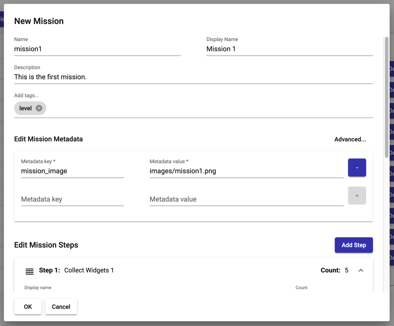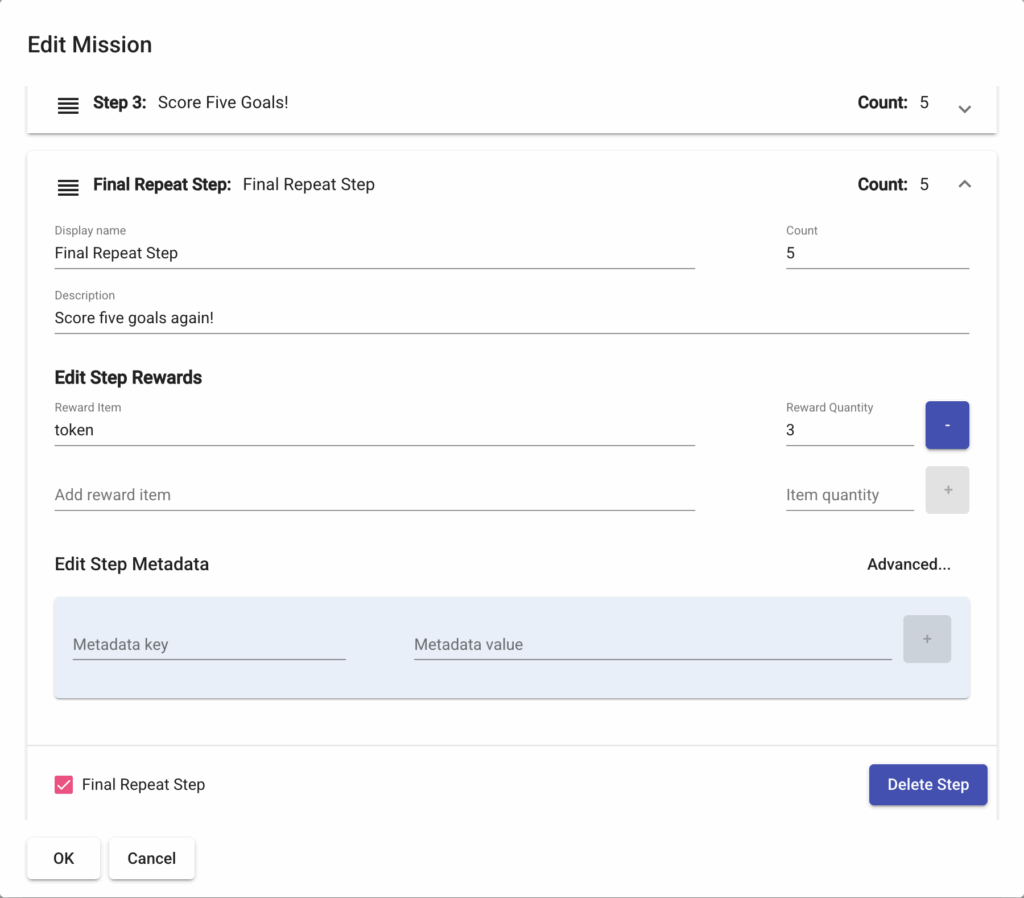 - metadata: Metadata is optional. Steps can have their own metadata separate from the overarching mission. It can be any number of named strings or integers. Metadata can have many uses. For example, secondary descriptions, asset paths, types, or any arbitrary values assigned to your mission step.
