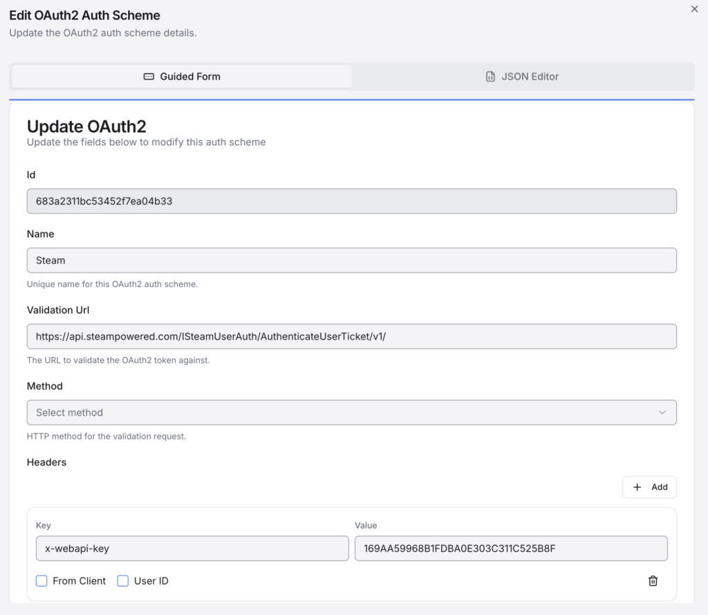 One of the default OAuth2 Auth Schemes is for authenticating via Steam. We’ll use this as an example as to how these can be used.