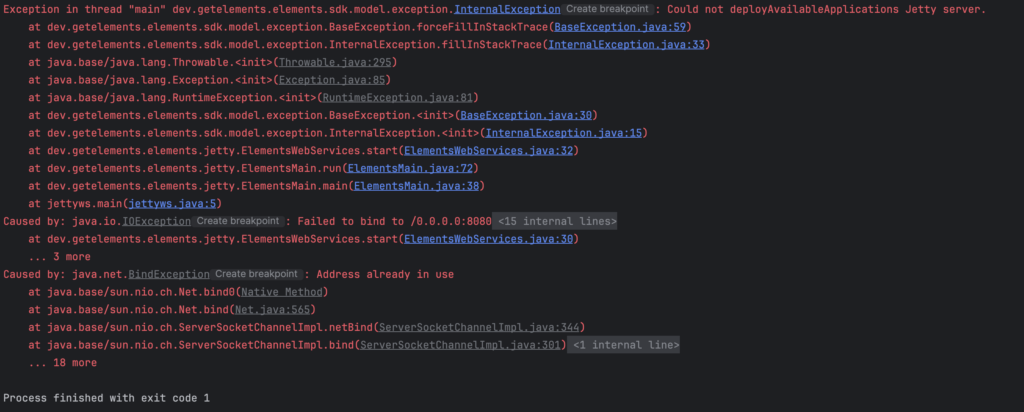 Exception in thread "main" dev.getelements.elements.sdk.model.exception.InternalException: Could not deployAvailableApplications Jetty server.
