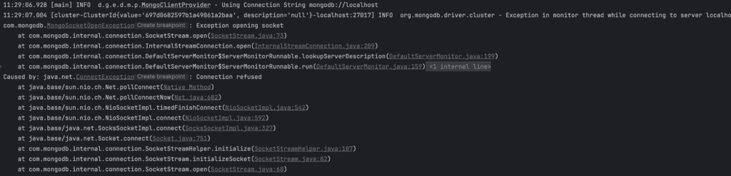 [cluster-ClusterId{value='697d0682597b1a49061a2baa', description='null'}-localhost:27017] INFO org.mongodb.driver.cluster - Exception in monitor thread while connecting to server localhost:27017
