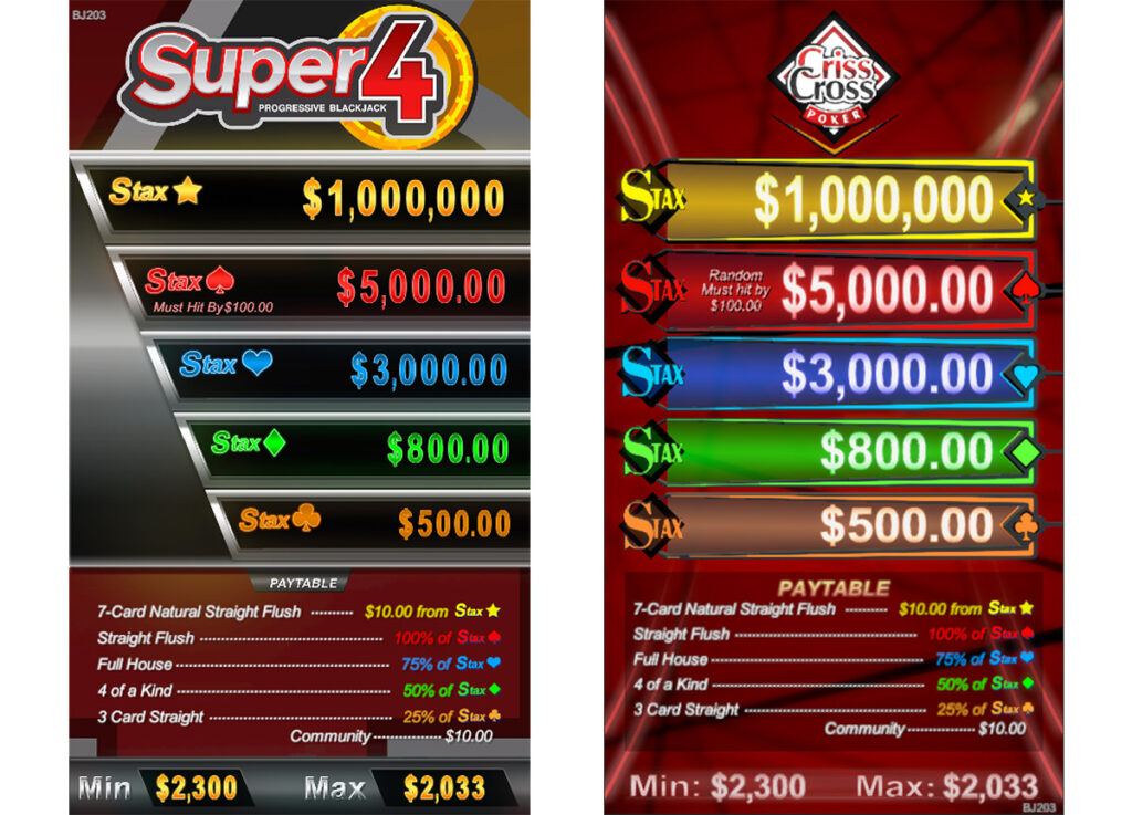 Stax is an award-winning casino game display offering multiple progressive meters to the players at once. Each meter updates independently with its own win criteria. The Stax sign can be configured with a multitude of games and aesthetic themes. Prizes, winning hands, pay tables, etc., can be set to any arbitrary value.